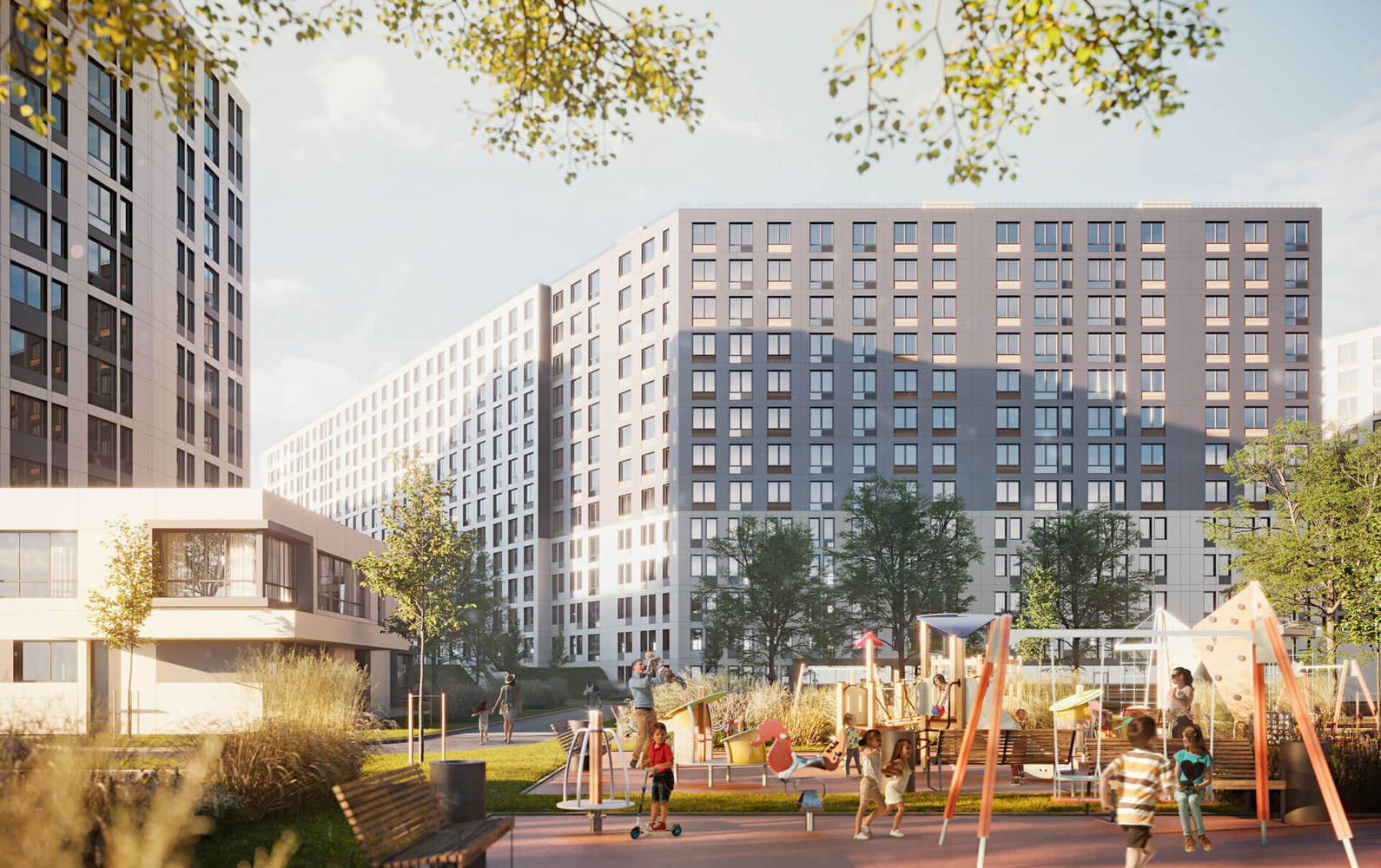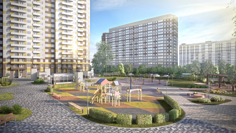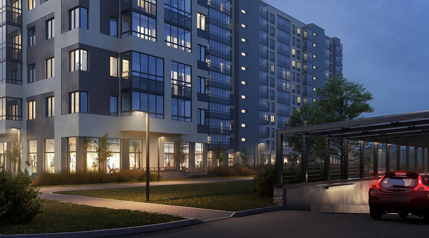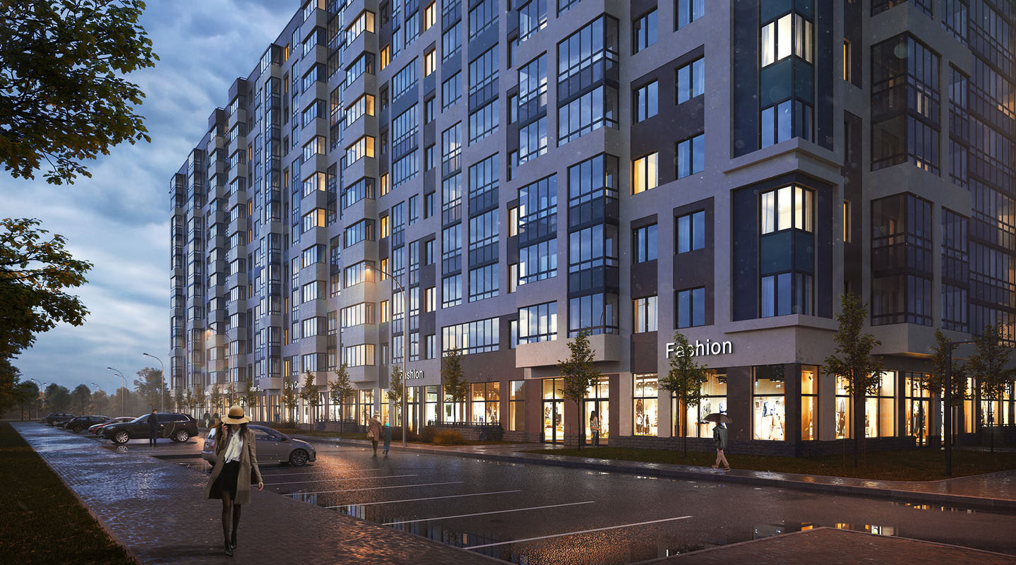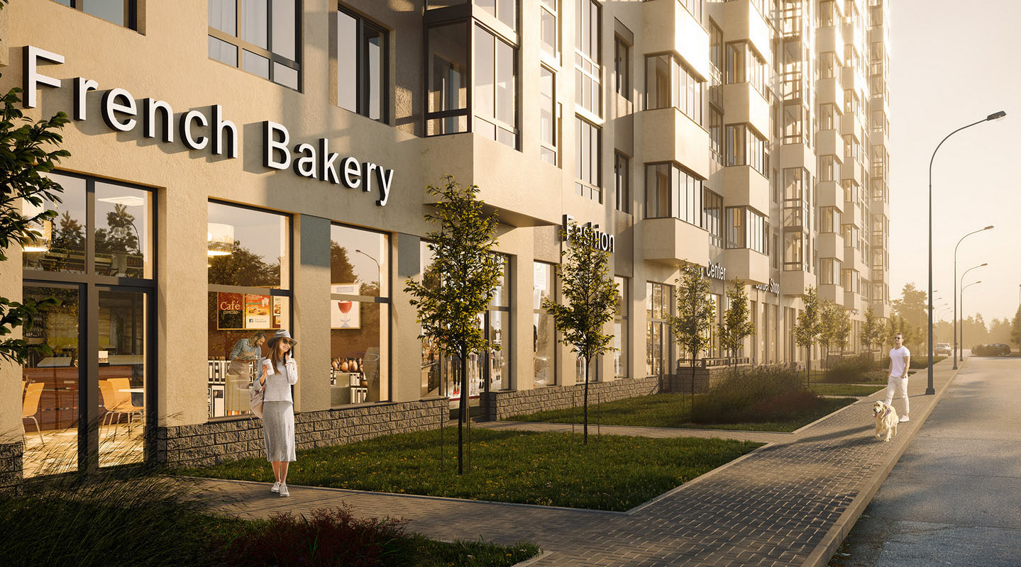На территории жилого комплекса будут оборудованы площадки для прогулок с детьми и занятий спортом. Первые этажи ID Кудрово будут отведены под коммерческие помещения: аптеки, кафе и магазины.